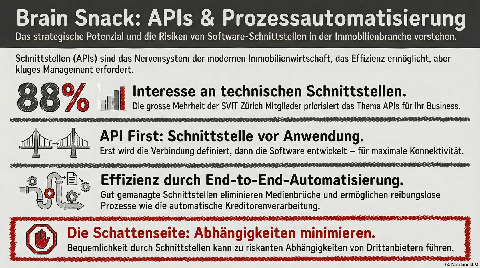 Das Bewusstsein für diese technologische Notwendigkeit ist in der Schweizer Immobilienwirtschaft längst vorhanden. Die jüngsten Erhebungen unter den Mitgliedern des SVIT Zürich sprechen eine deutliche Sprache und wirken wie ein Mandat an die Software-Provider, ihre Systeme endlich zu öffnen: 88 % der SVIT Zürich Mitglieder priorisieren das Thema technische Schnittstellen (APIs). Dieser Wert ist ein massiver Weckruf. Die Mitgliederumfrage (SVIT Zürich, 2022) hat ergeben, dass die Branche den digitalen Stillstand überwinden will. Es geht nicht mehr um die Beschaffung isolierter Tools, sondern um die nahtlose Vernetzung der gesamten Wertschöpfungskette.